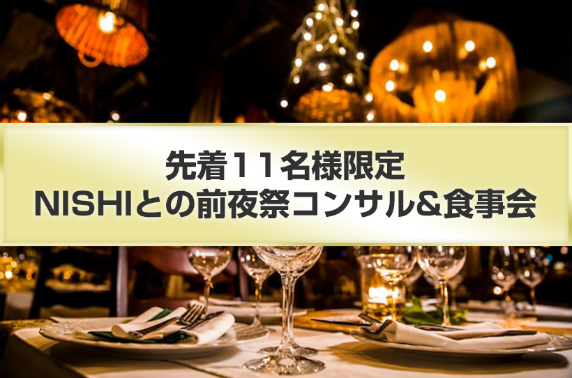 NISHI本人との、限られたメンバーでのコンサル食事会です。食事会ではありますが主眼はあなた自身の話を聞いて、強みや商品を引き出す事にあります。少人数で行う事によって集中してコンサルできます。また食事も交えたリラックスした場の方が本音ベースのお話もしやすいです。初回セミナー前日の10月25日(金)に開催します。